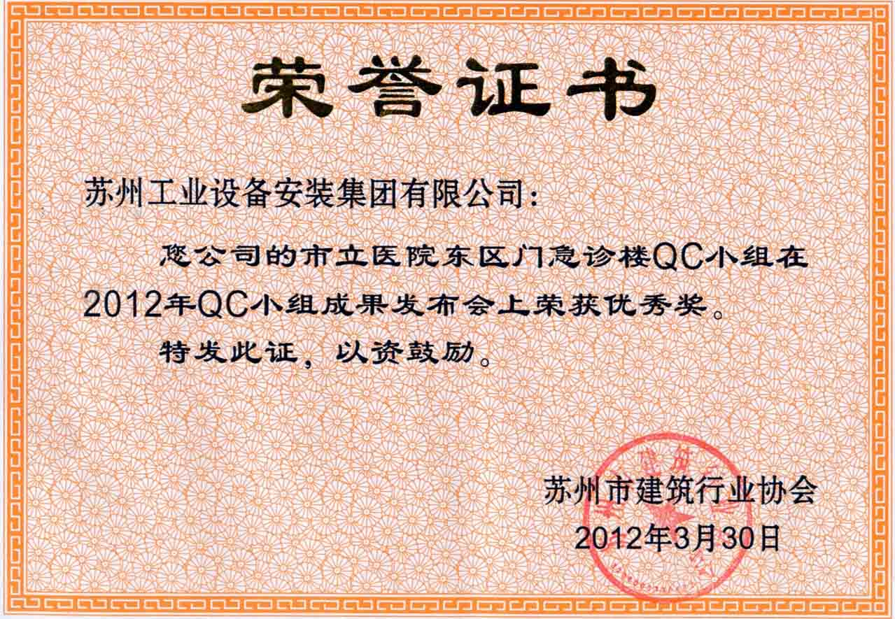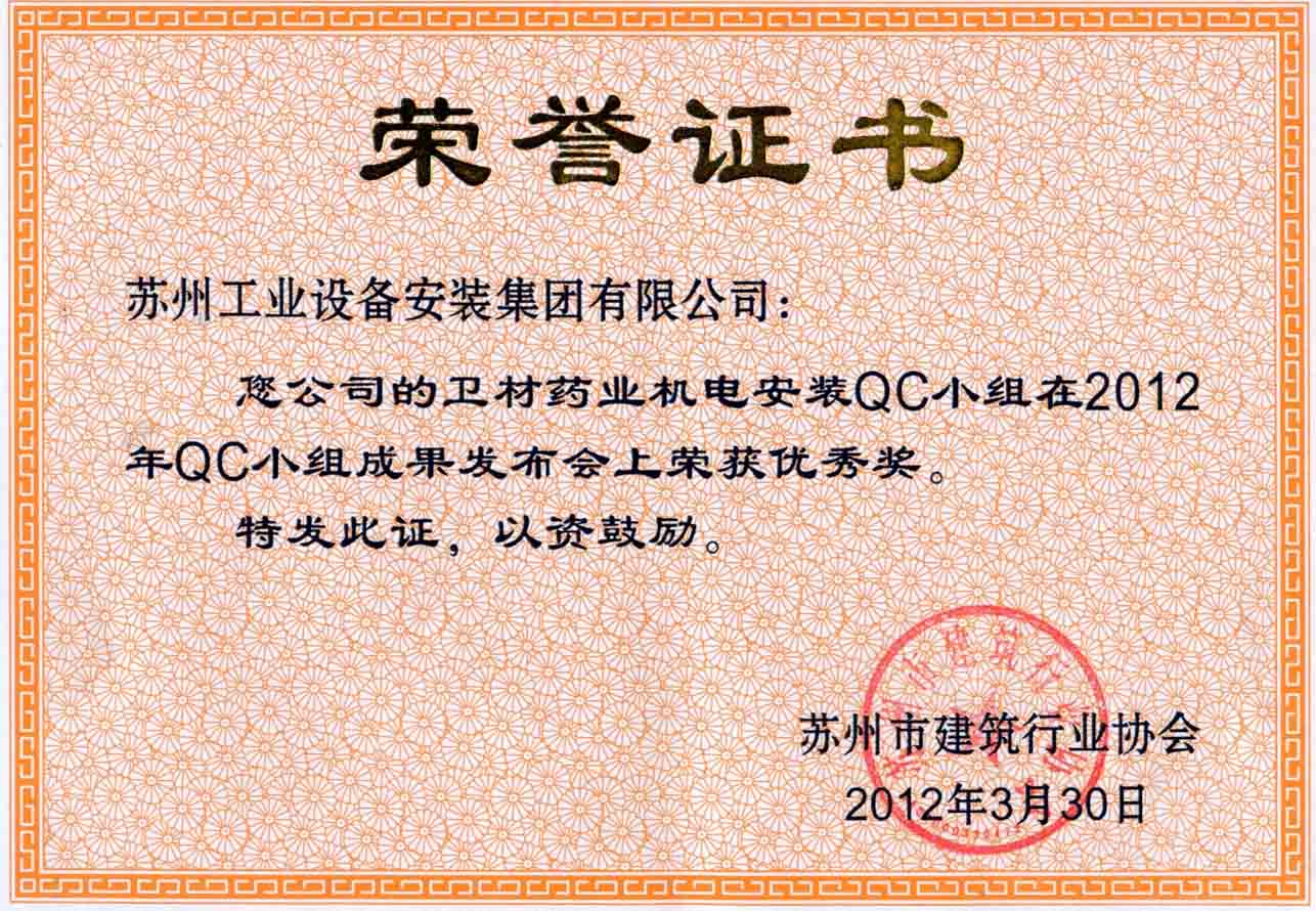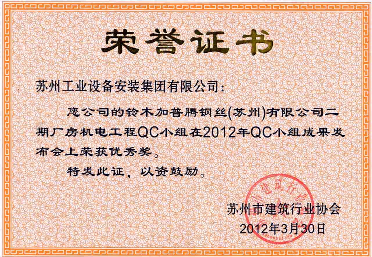 铃木加普腾钢丝(苏州)有限公司二期厂房机电工程QC小组在2012年QC小组成果发布会上荣获优秀奖