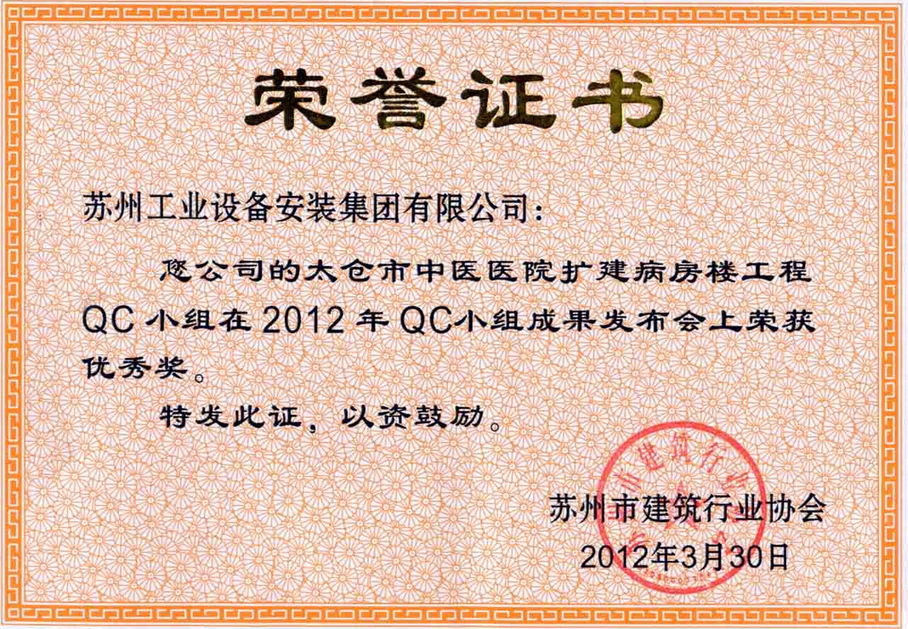 太仓市中医医院扩建病房楼工程QC小组在2012年QC小组成果发布会上荣获优秀奖