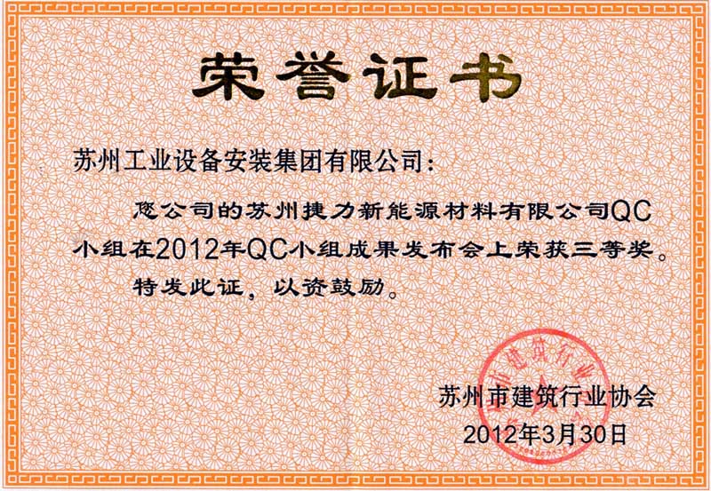 苏州捷力新能源材料有限公司QC小组在2012年QC小组成果发布会上荣获三等奖