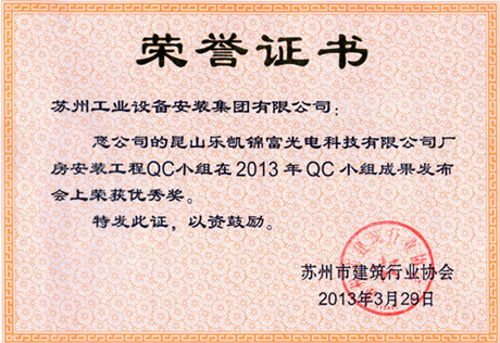 昆山乐凯锦富光电科技有限公司厂房安装工程QC小组在2013年QC小组发布会上荣获优秀奖